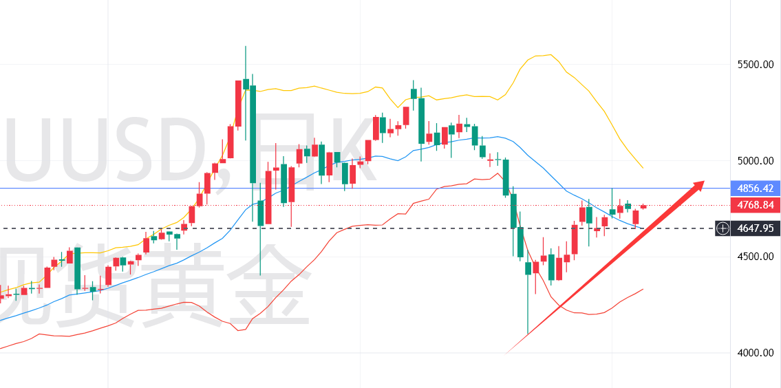 技术面解析:日线级别来看,金价整体处于中期上行趋势当中 ,上一交易日收出长下影阳线,彻底夯实下方支撑,形成典型的探底回升形态 ,完美回补早盘跳空缺口,多头力量占据绝对主导。当前金价稳稳站稳5日、10日 、20日均线之上,均线系统全程呈现多头排列 ,各周期均线同步向上拐头,逐步形成层层支撑,短期均线支撑上移至4745美元附近。附图指标MACD快慢线在0轴上方金叉发散 ,红色动能柱持续增量 ,多头动能稳步释放;KDJ指标处于中高位区间向上运行,无明显超买死叉信号;RSI指标维持在强势区间,布林带轨道开口向上 ,金价紧贴中轨上方运行,逐步向上轨靠拢,整体趋势单边偏强 ,仅存在短线技术性回调可能,无实质性空头反转信号 。