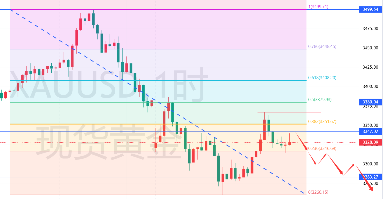 从小时级盘面进行技术分析,昨日低点处于 3306 美元,而刚刚的反弹在此位置出现了明显的止步信号。基于此 ,目前短期压制位可参考 3315 美元,再往上则是 3328 美元。对于短线投资者而言,可考虑等待金价反弹至 3315 美元附近时布局空单 ,继续看跌金价 。下方首要关注 3287 美元这一刚刚触及的低点支撑情况,若该支撑位失守,下一个关键支撑位将是 3260 美元这一前期下行途中的首个低点。若 3260 美元也被有效跌破 ,空头力量将进一步释放 ,金价可能面临更大幅度的下跌。